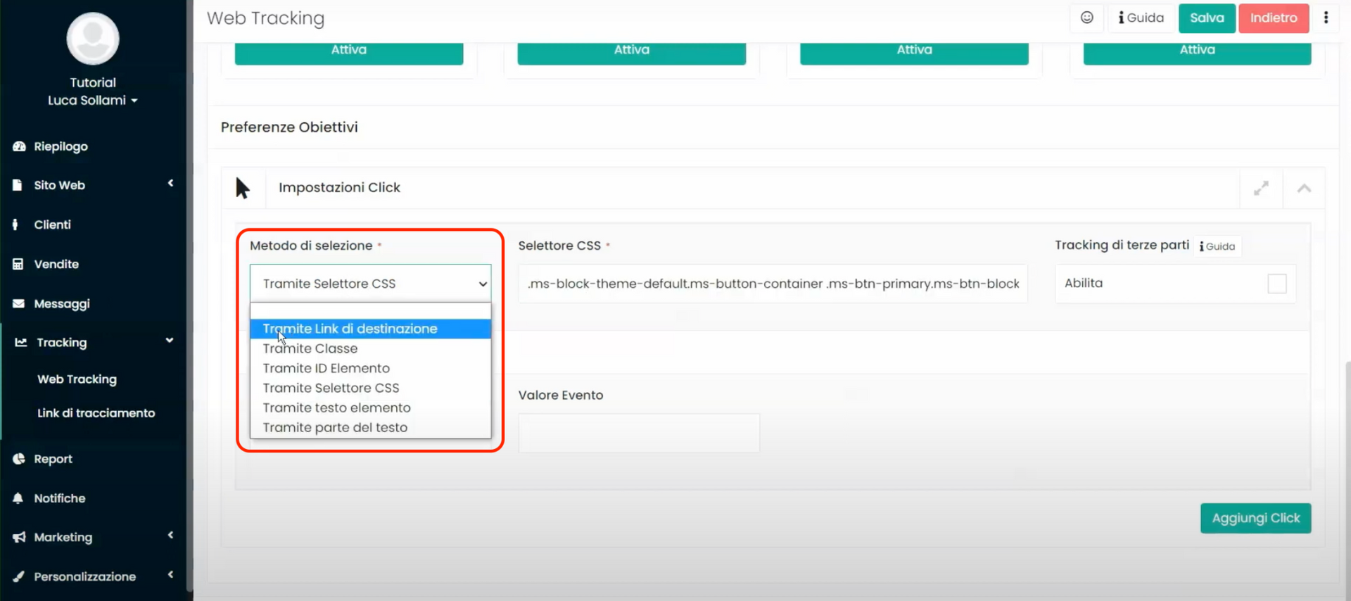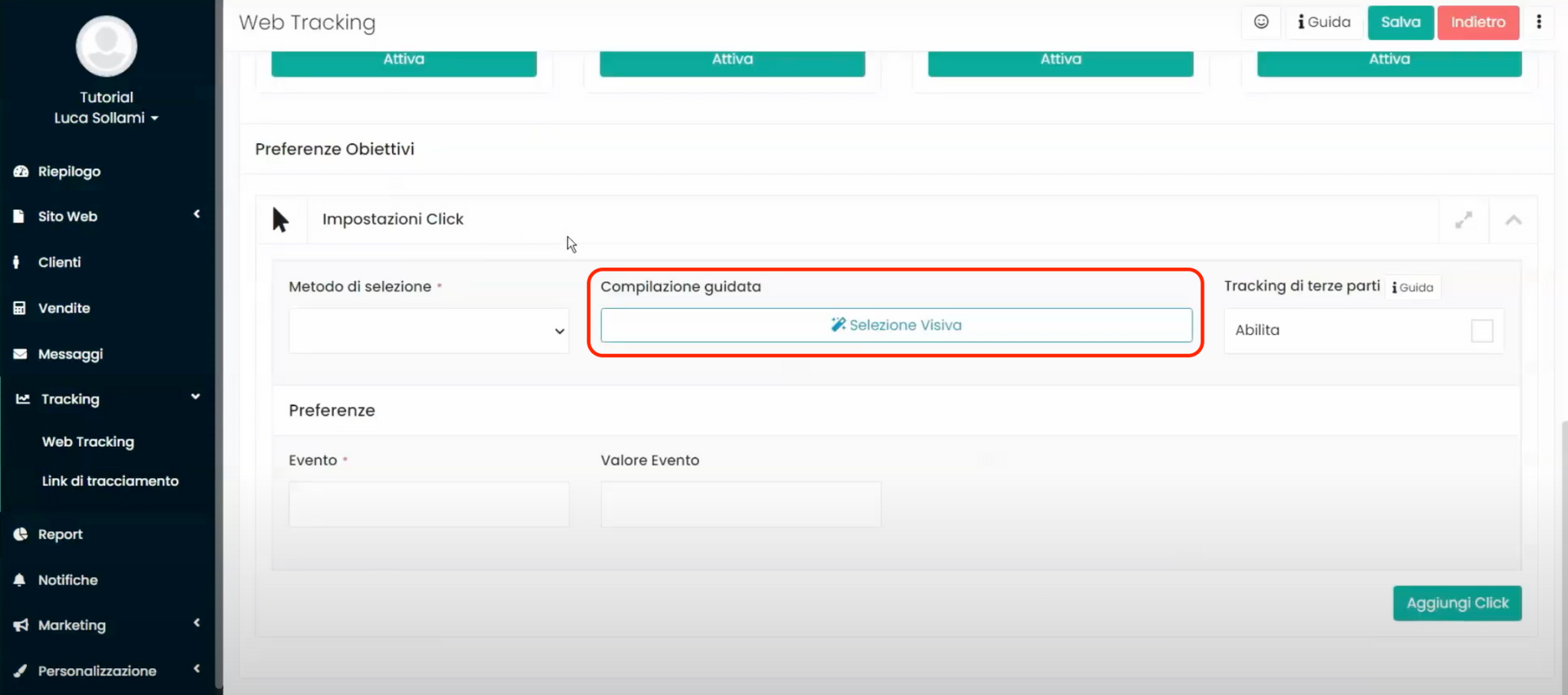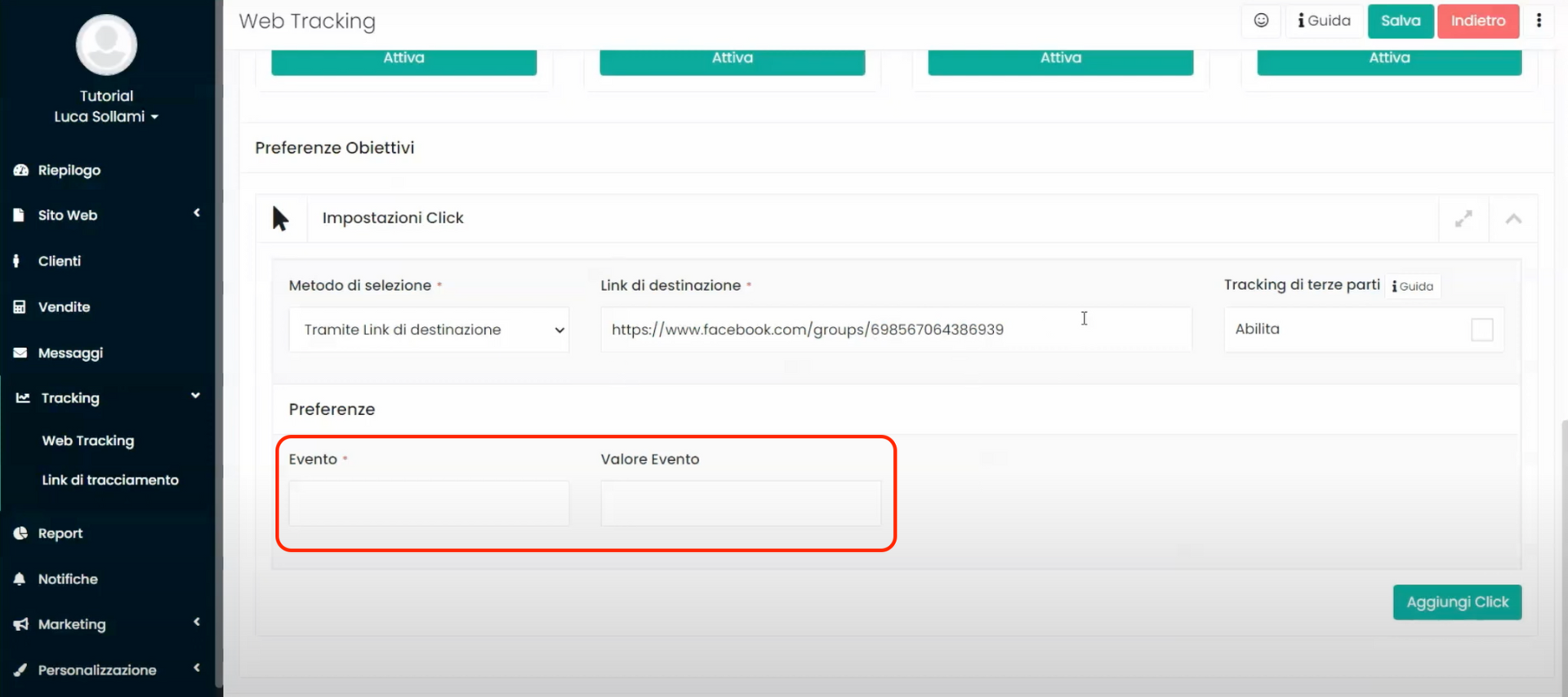 Finalmente, siempre en la pantalla de configuración del objetivo “Clic”, habilitando la opción “Seguimiento de terceros”, è posible enviar las acciones rastreadas también a las plataformas publicitarias configuradas dentro del proyecto de Web Tracking. Después de haber habilitado el envío del seguimiento, Framework360 nos permitirá definir el nombre del evento y el eventual valor del evento para cada una de las plataformas publicitarias configuradas.