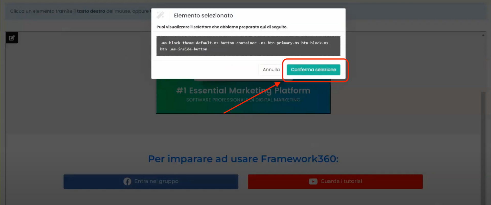 Junto a la opción “Método de seguimiento”, si no hemos definido un método entre los propuestos, aparecerá el botón “Selección visual”. Al hacer clic en este último, Framework360 abrirá un iframe de nuestro sitio web, donde podremos hacer clic directamente en el botón que queremos rastrear, como se muestra en las figuras siguientes: