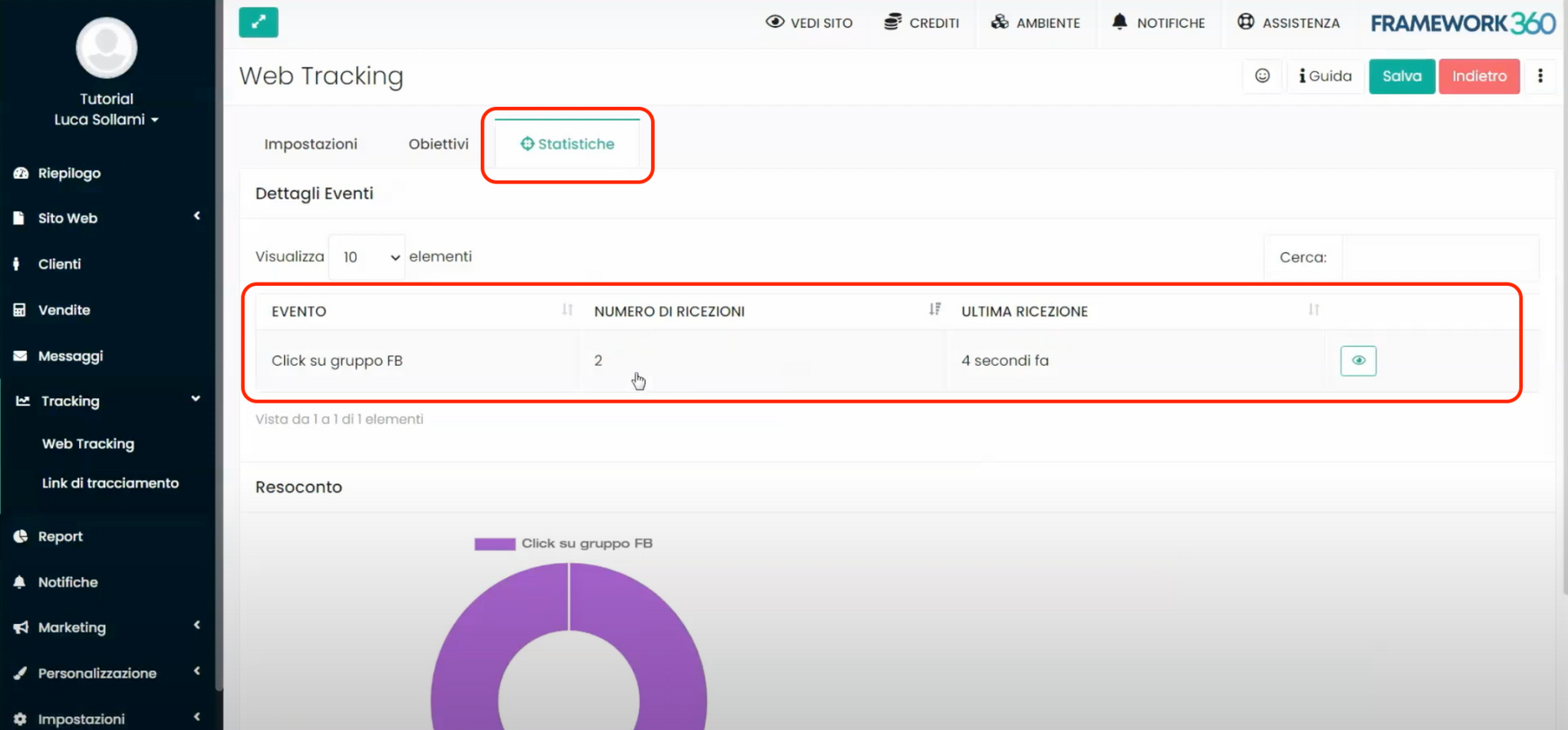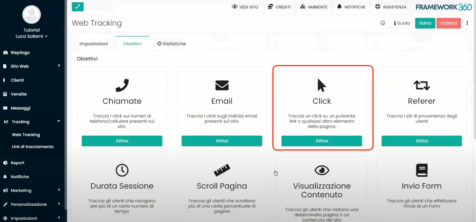 El objetivo principal de este tutorial, en cambio, es comprender cómo habilitar el objetivo de seguimiento de un clic entre los objetivos de nuestro proyecto de tracking. A tal fin, después de haber configurado lo solicitado en la pestaña “Configuraciones” y haber guardado el proyecto con el botón verde “Guardar” presente en la parte superior derecha, notaremos que se habrán abierto dos pestañas adicionales: la pestaña “Objetivos” y la pestaña “Estadísticas”:
